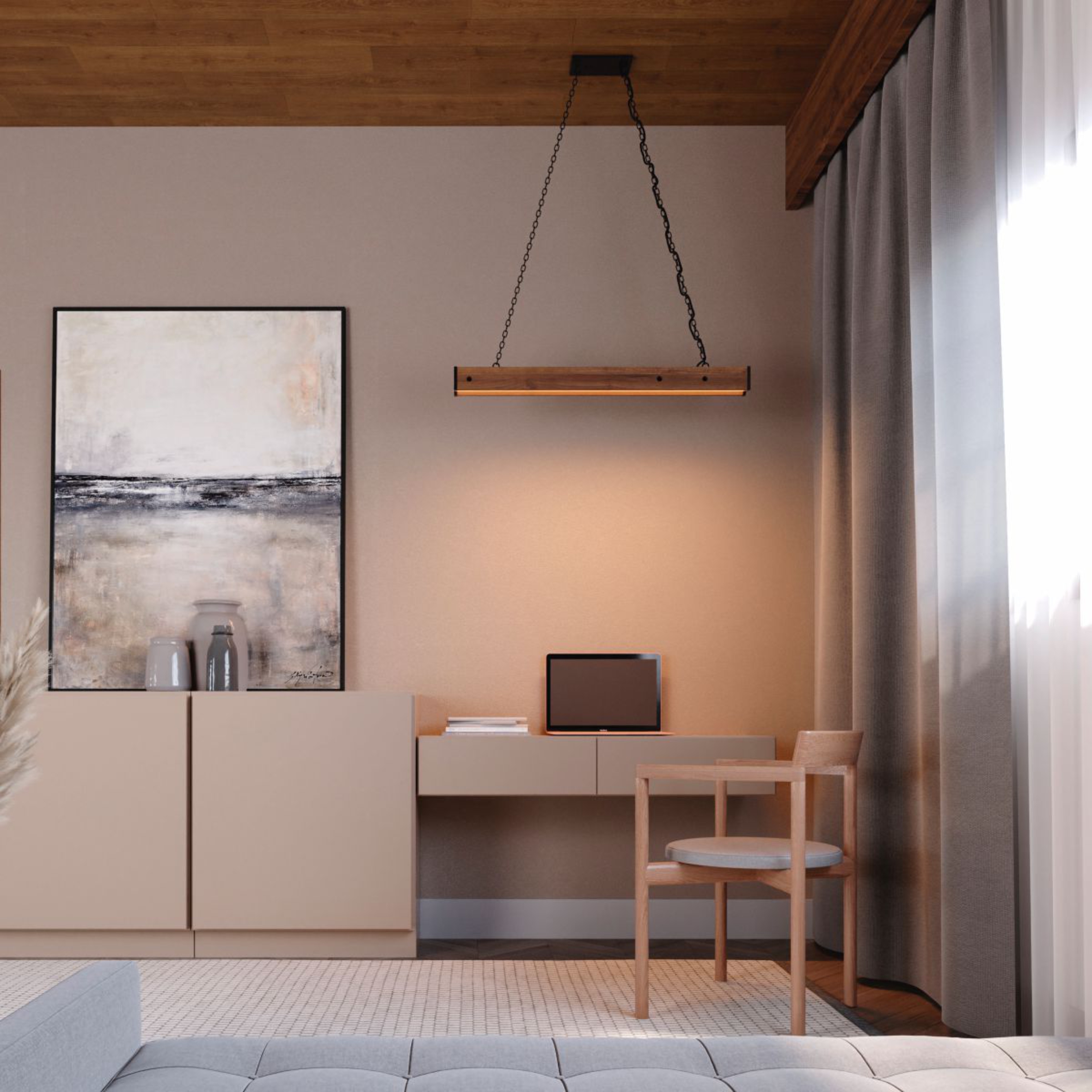 Pendente fabricado em madeira maciça de demolição, indicado para vários ambientes trazendo um conceito rústico contemporâneo. Produto composto por 1 perfil de LED, disposto no centro, com driver embutido de 36w.