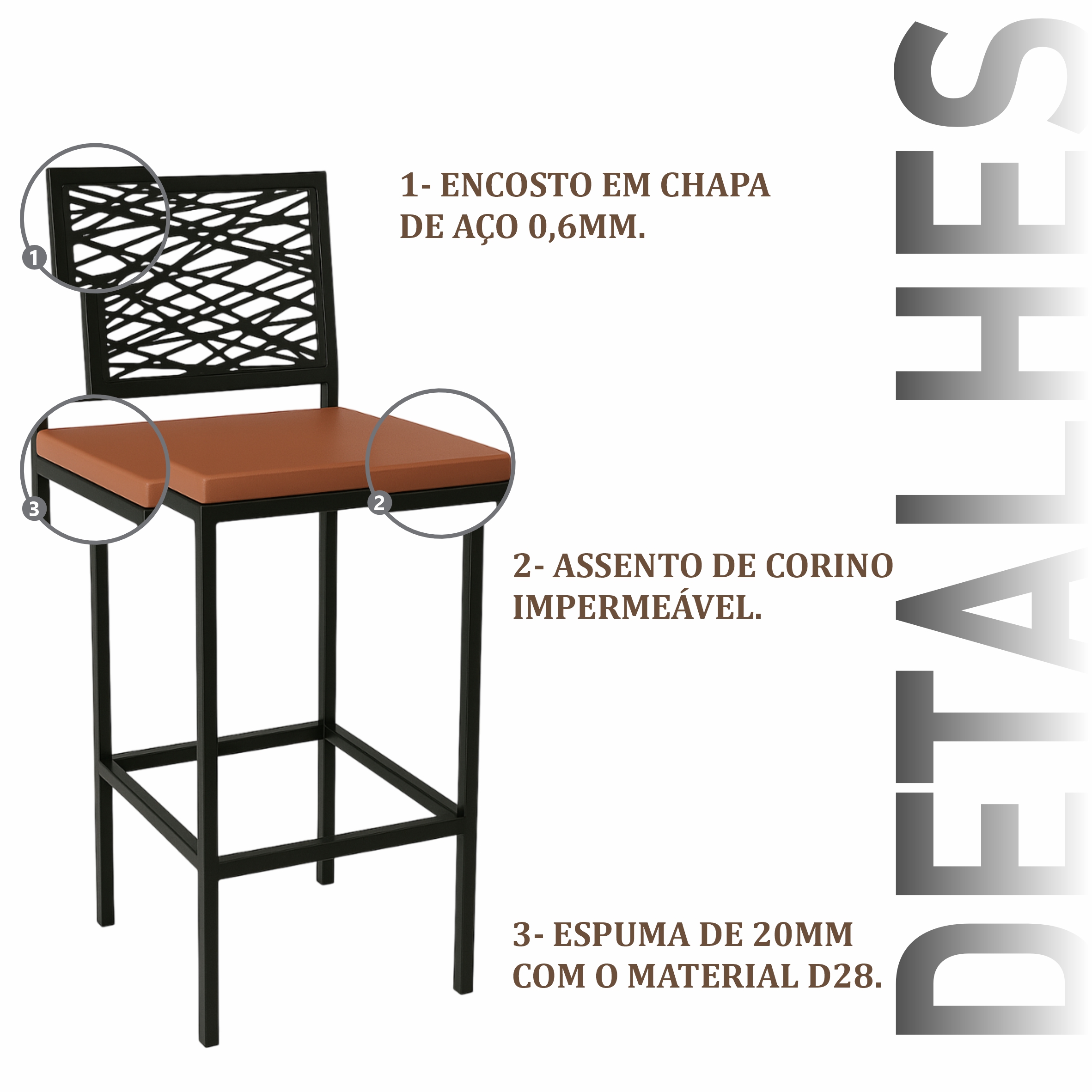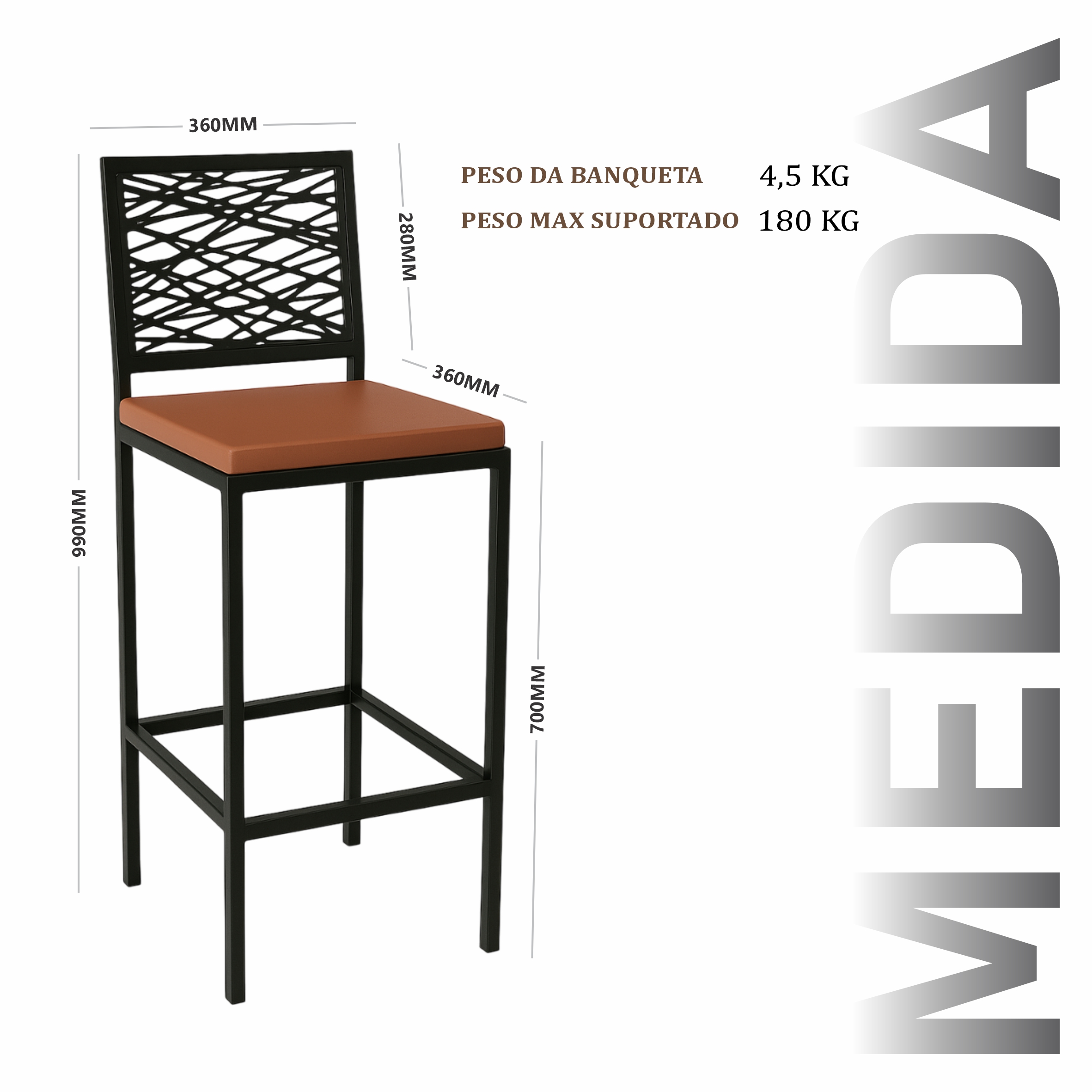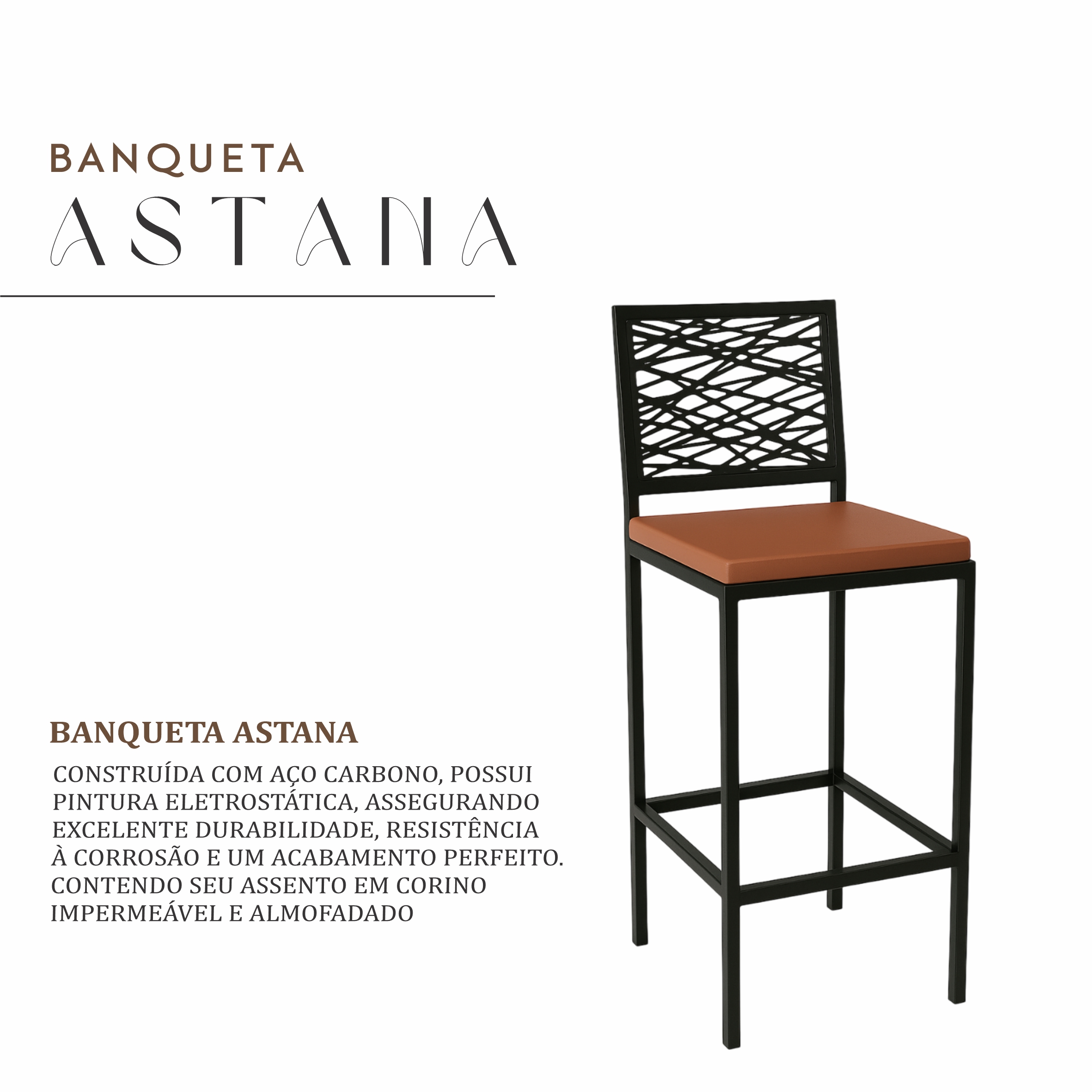 Banqueta Astana com encosto em estrutura aço carbono, com pintura eletrostática, com encosto de chapa de aço 0,6mm, assento de corino composto de espuma de 20mm.