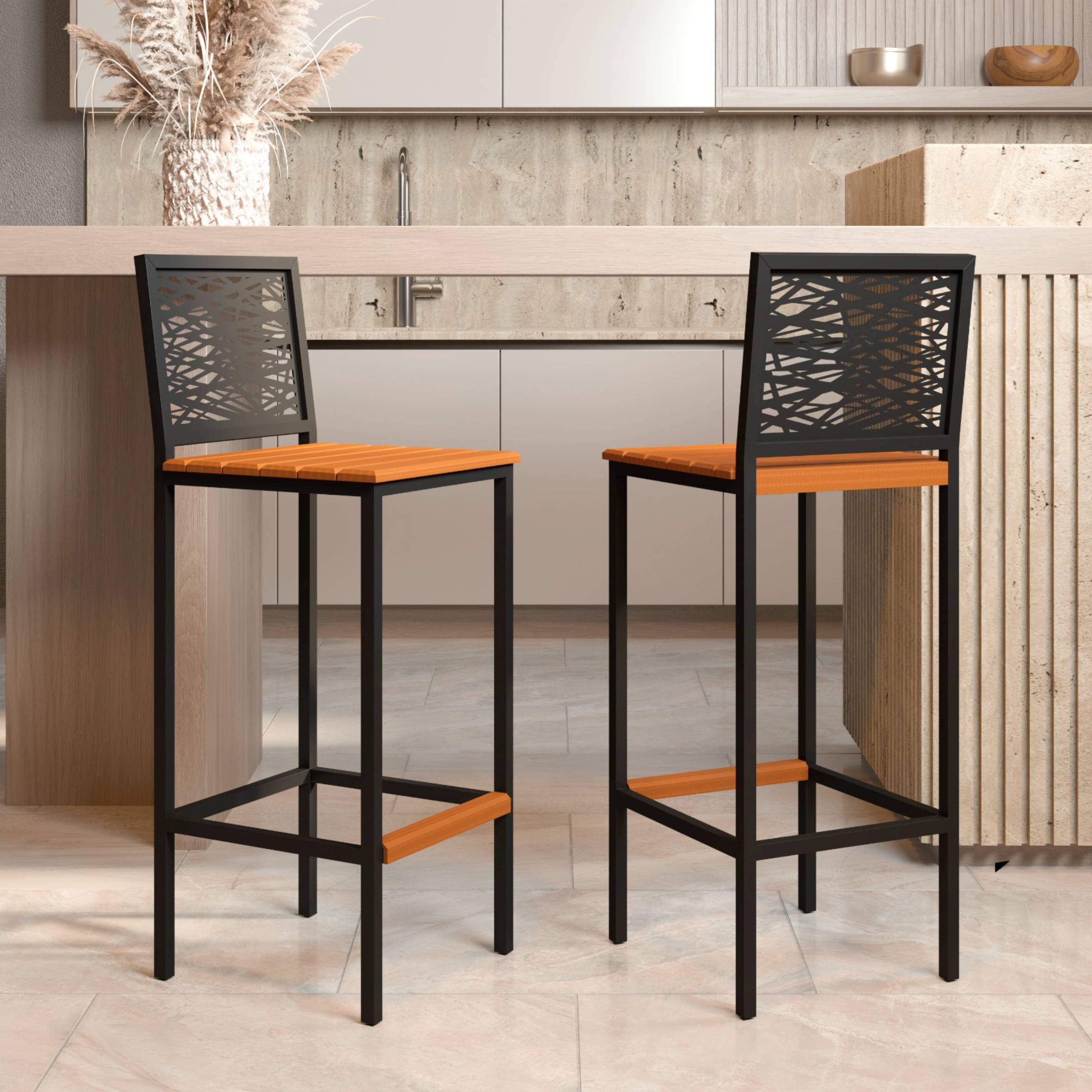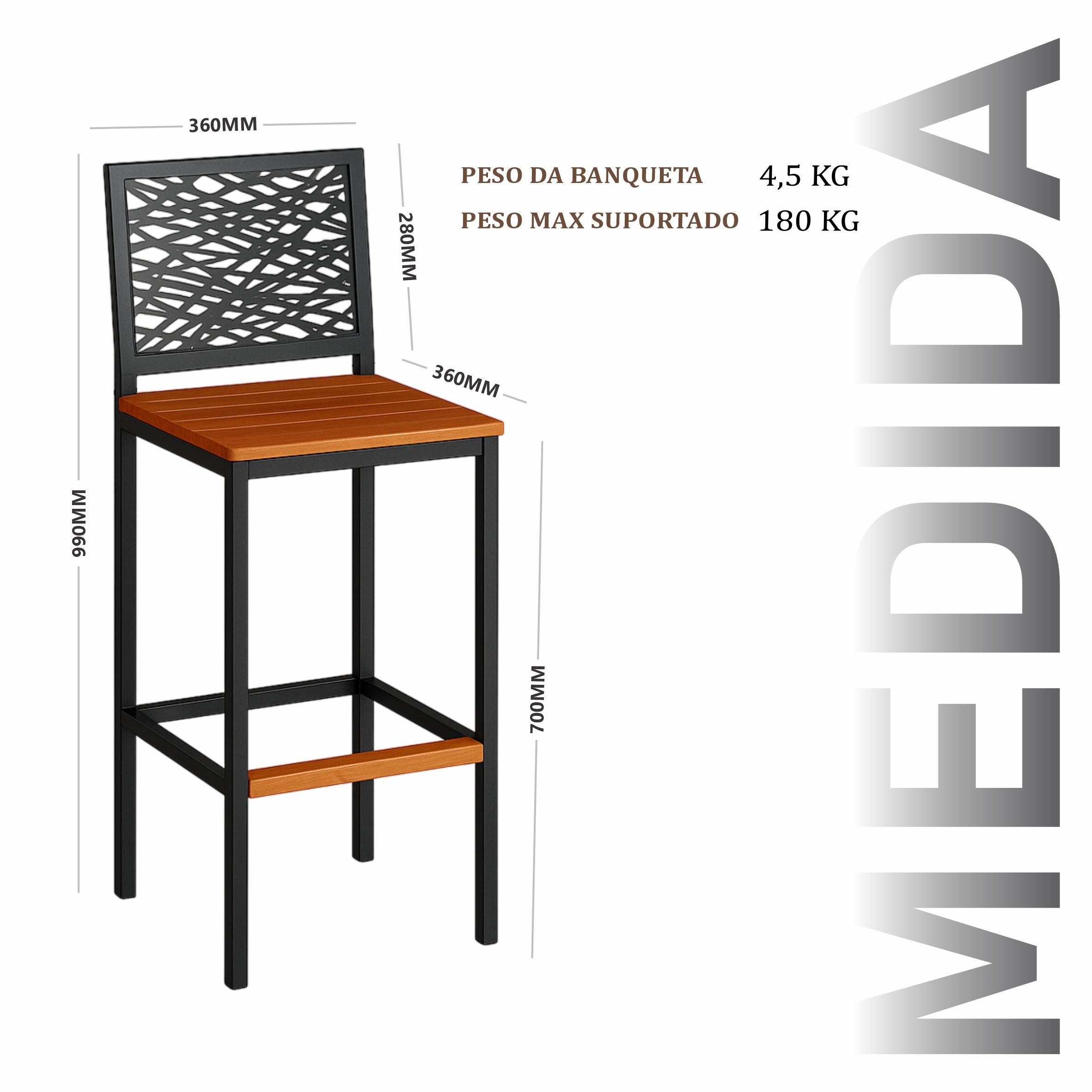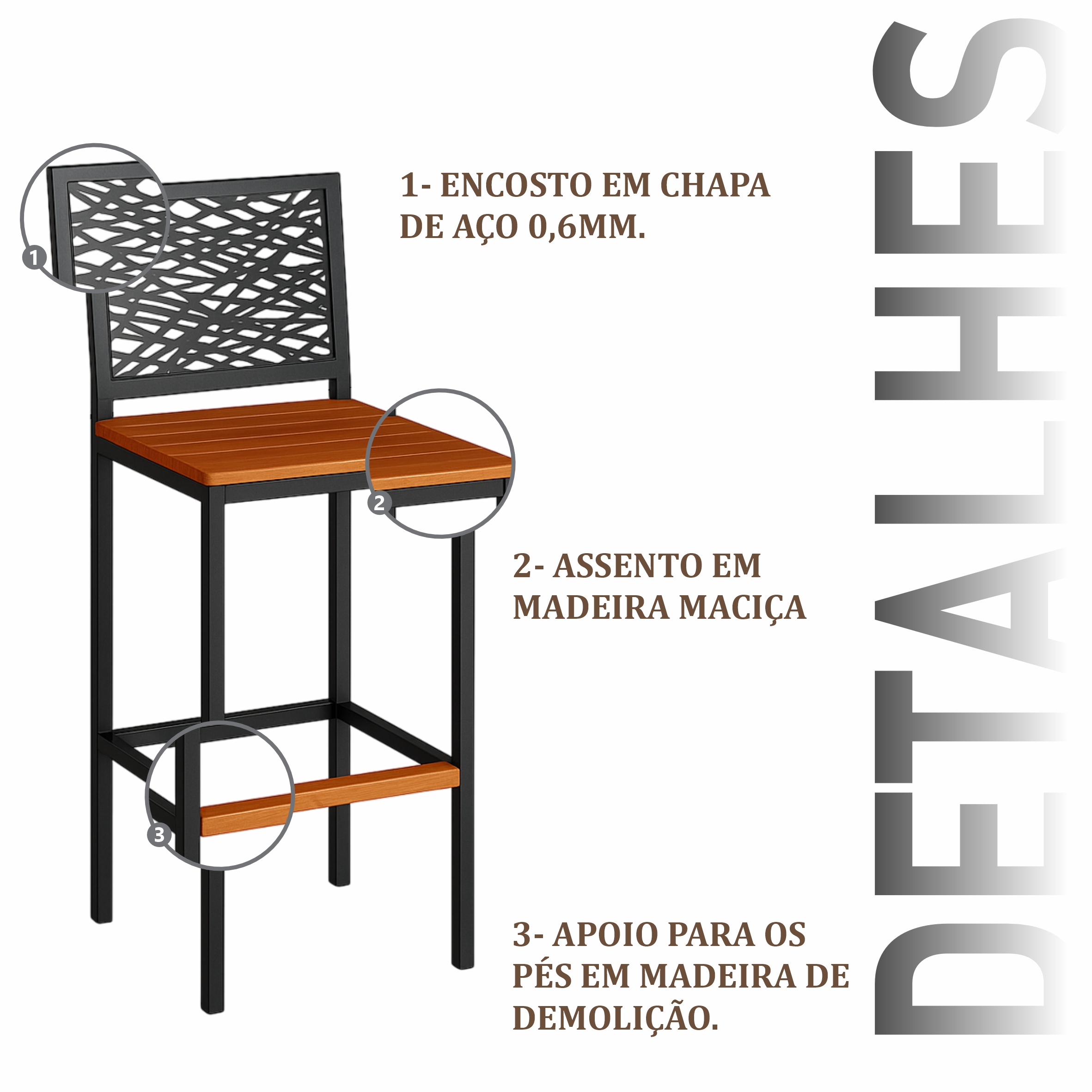 Banqueta Astana com encosto em estrutura aço carbono, com pintura eletrostática, com encosto de chapa de aço 0,6mm, assento de madeira maciça de demolição.