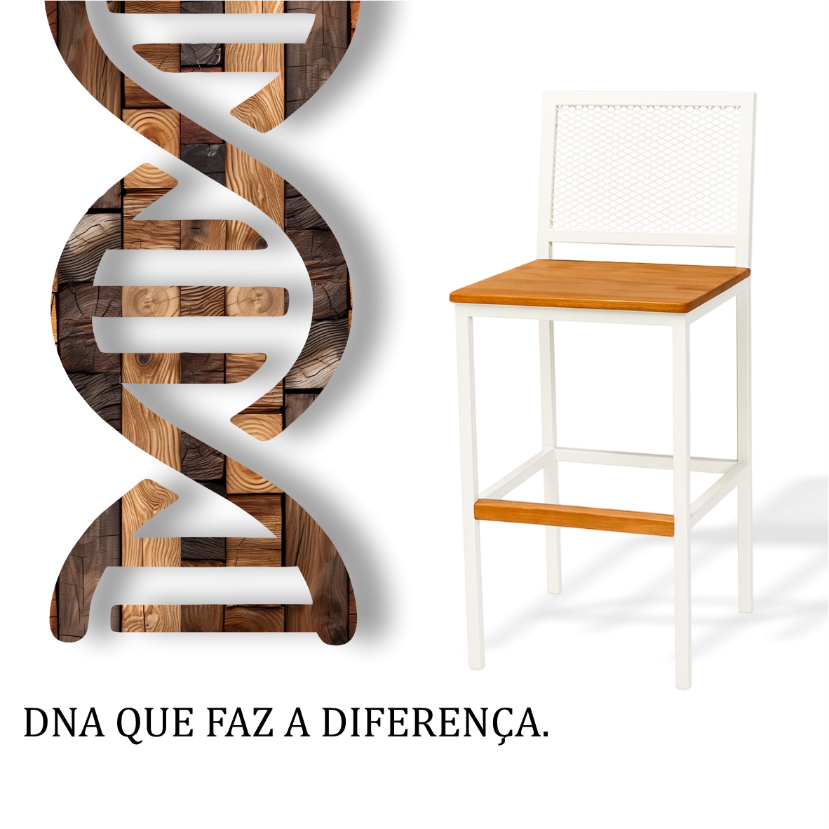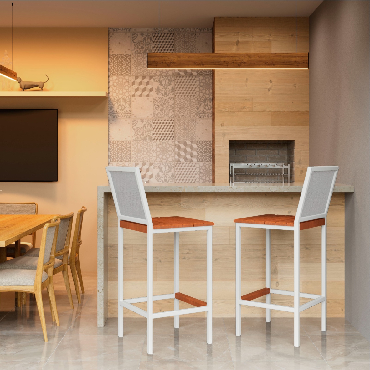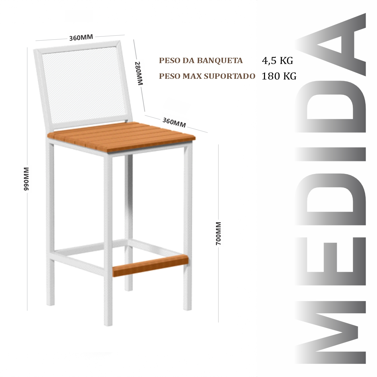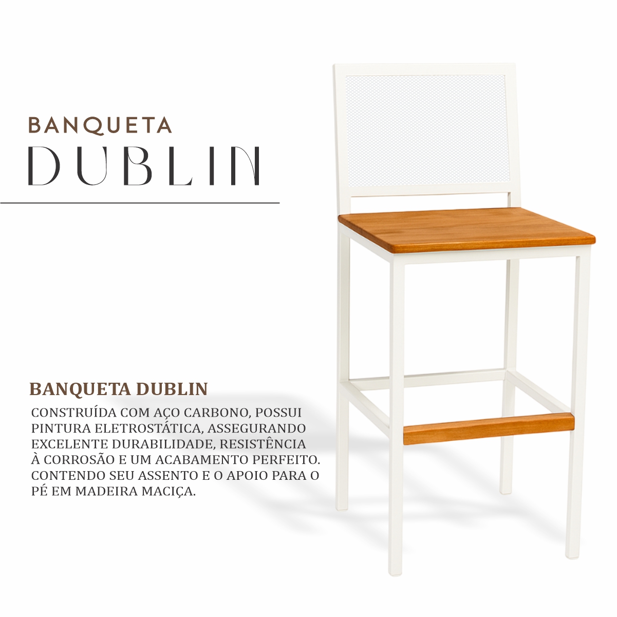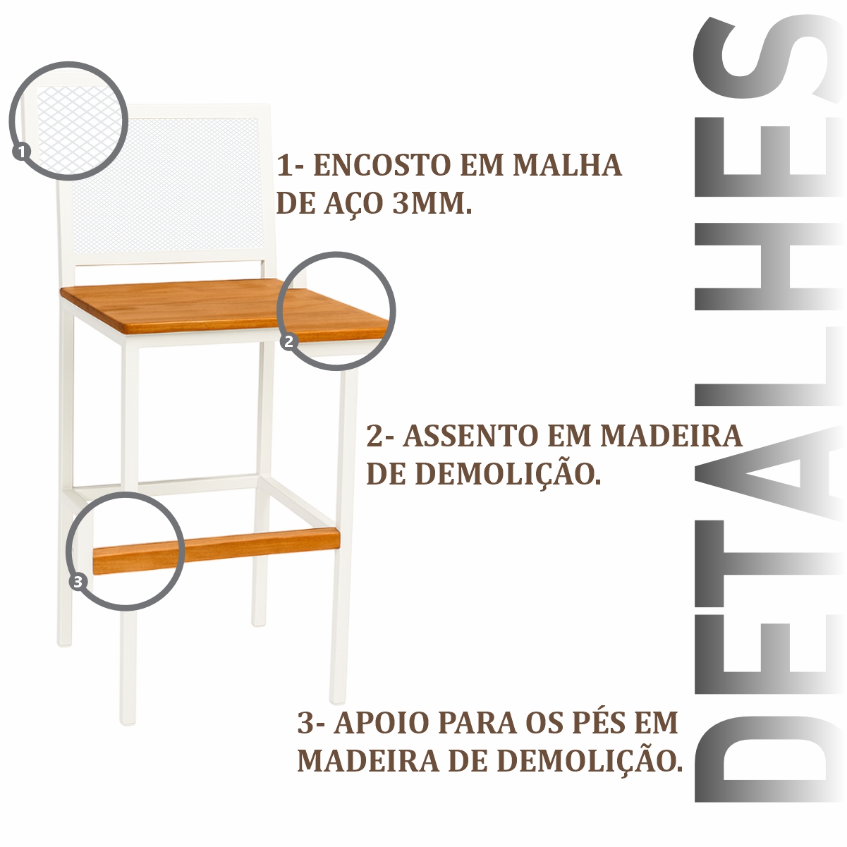 Banqueta Dublin com encosto fabricado em estrutura aço carbono, com pintura eletrostática, com encosto de malha de aço 3mm, assento de madeira de demolição.
