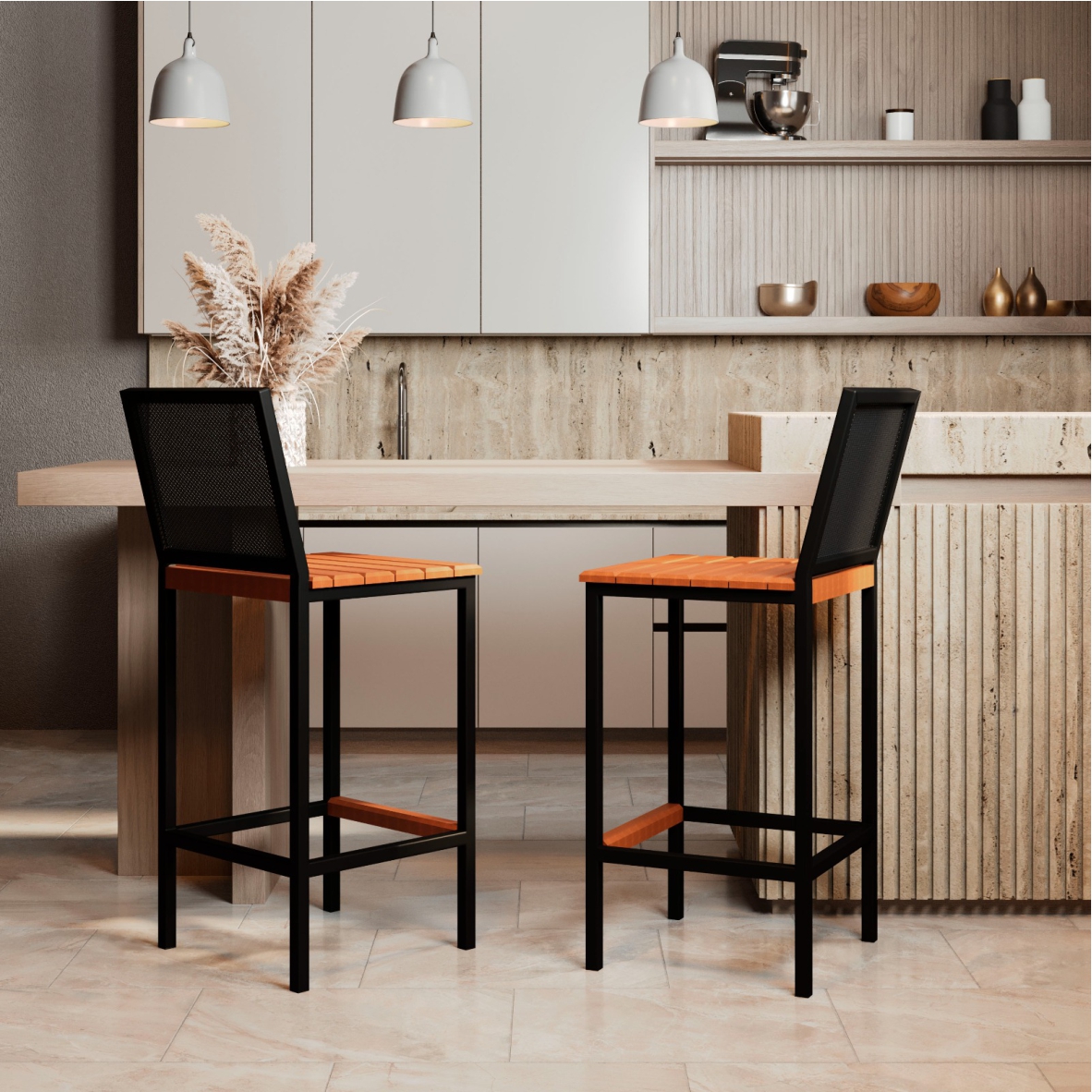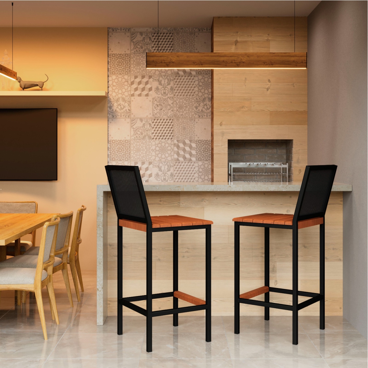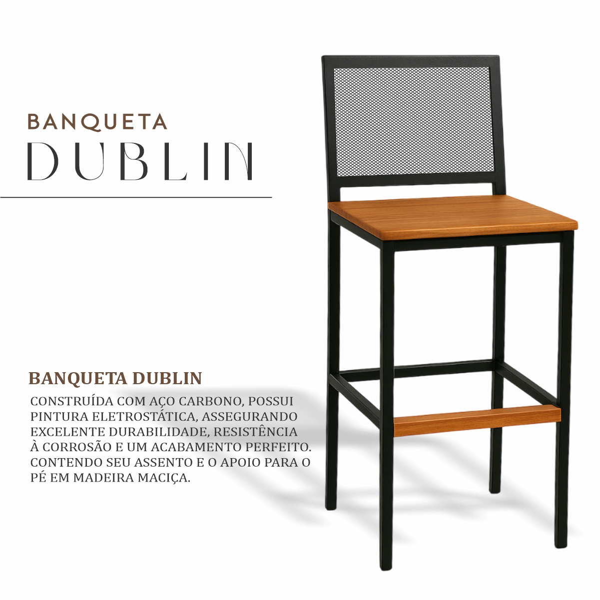 Banqueta Dublin com encosto fabricado em estrutura aço carbono, com pintura eletrostática, com encosto de malha de aço 3mm, assento de madeira de demolição.