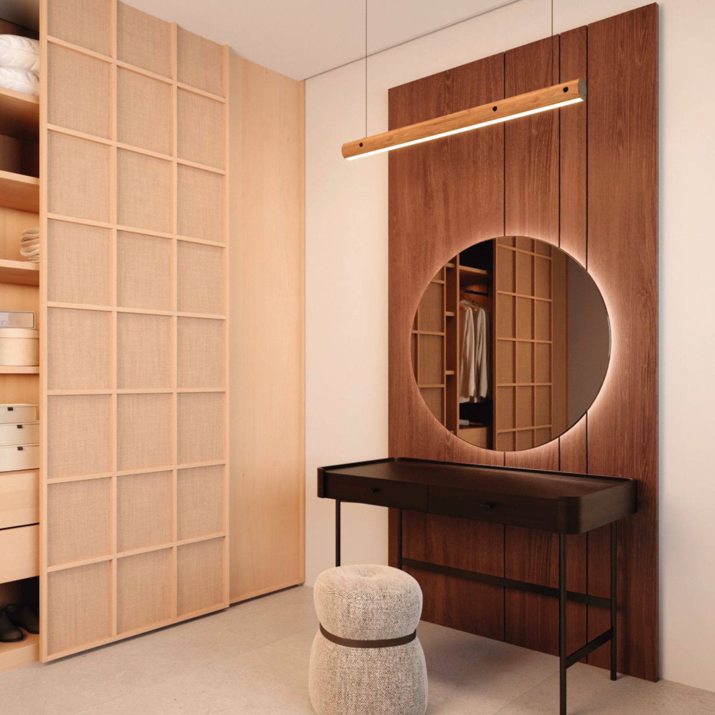 Pendente em madeira maciça de demolição. Produto com 1 perfil de LED no centro, com driver embutido de 36w. Design contemporâneo para diversos ambientes.