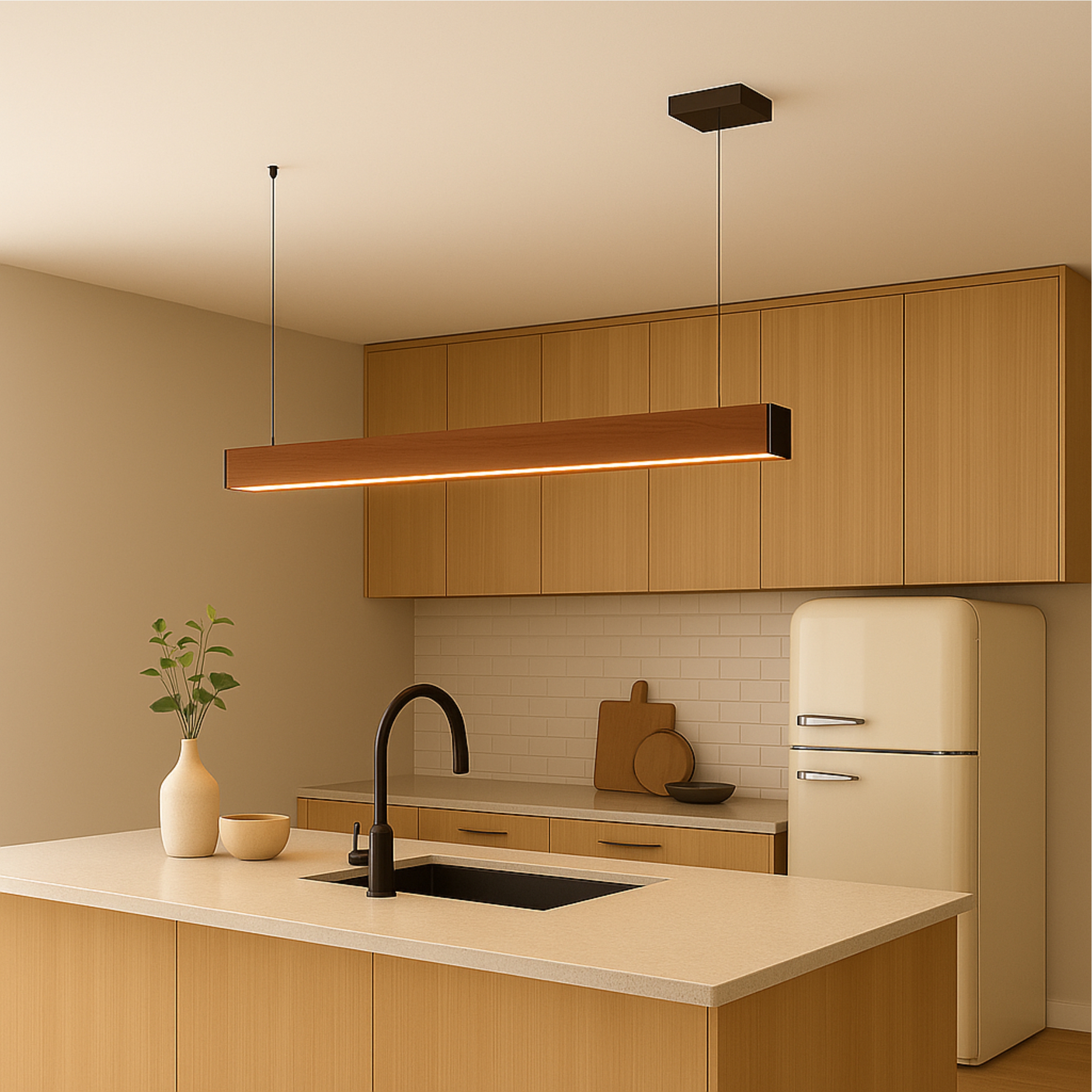 Pendente em madeira maciça de demolição. Produto com 1 perfil de LED no centro, com driver embutido de 36w. Design contemporâneo para diversos ambientes.