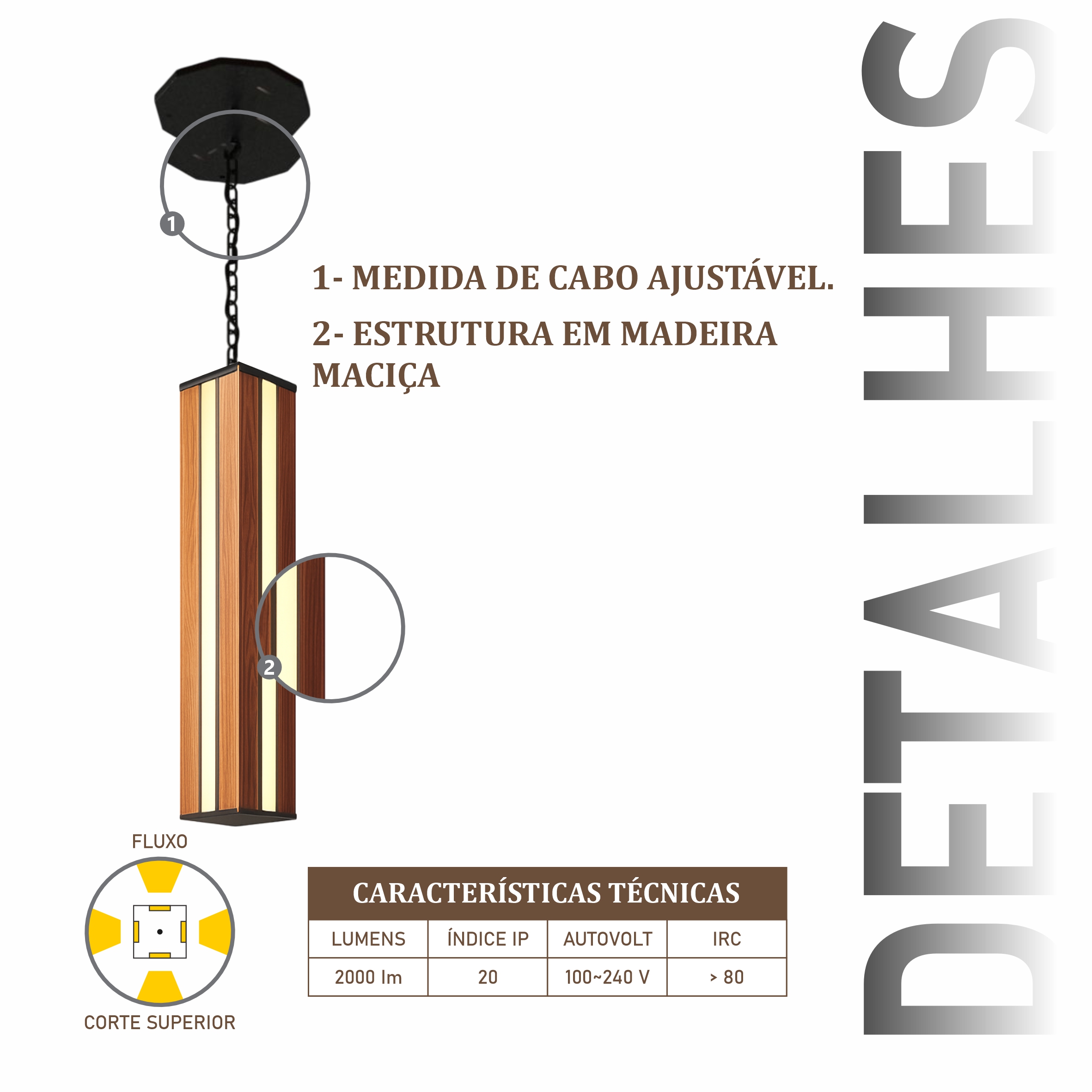 Pendente em madeira maciça de demolição. Produto com 4 perfis de LED no centro, com driver embutido de 36w. Design contemporâneo para diversos ambientes.