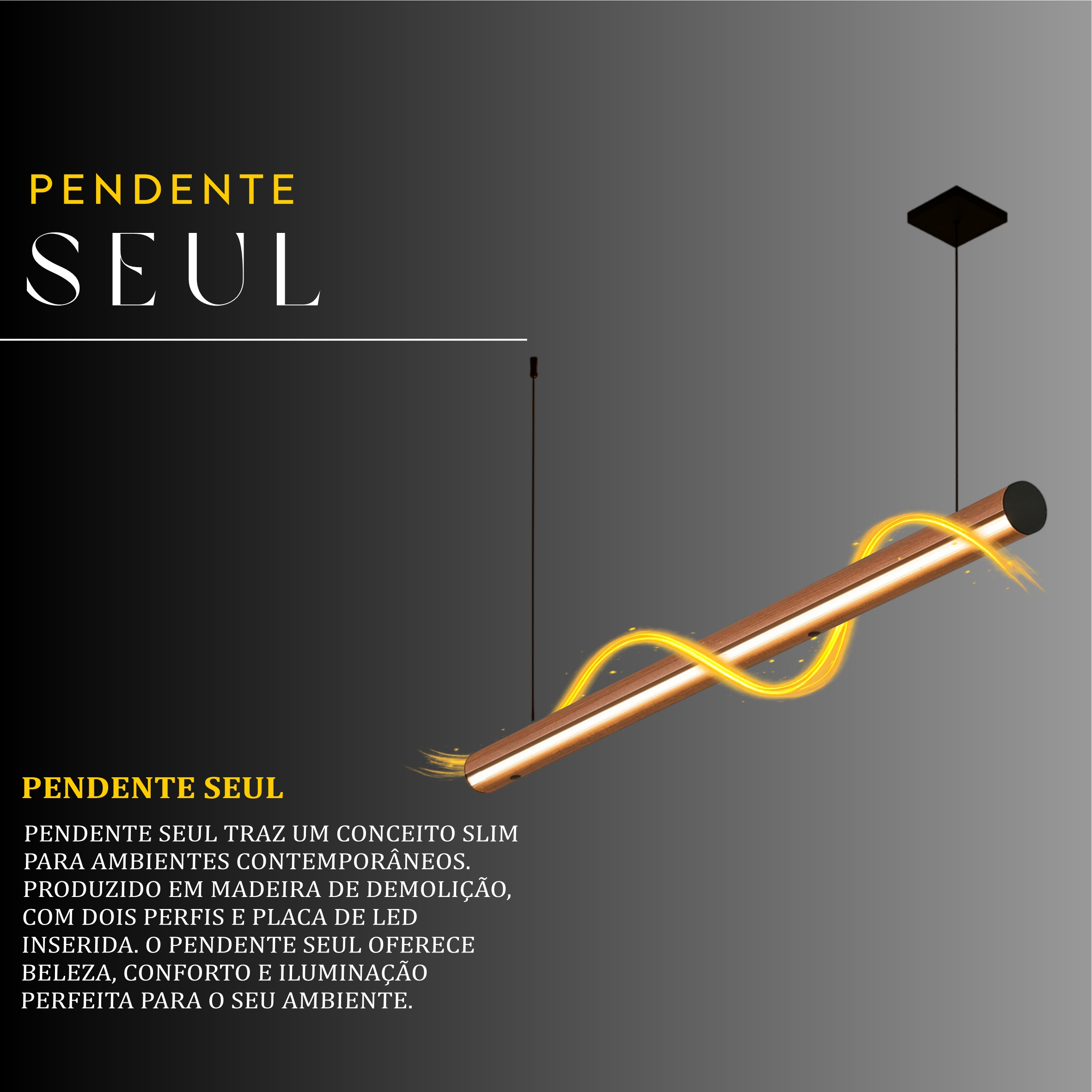 Pendente em madeira maciça de demolição. Produto com 2 perfil de LED no canto, com driver embutido de 36w. Design contemporâneo para diversos ambientes.