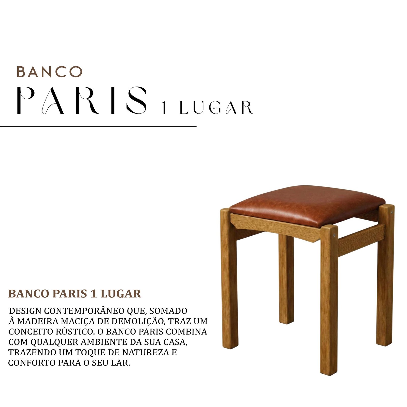Banco Paris de 1 lugar, produzido em courvin e madeira maciça de demolição. Design rústico e contemporâneo, perfeito para trazer charme, conforto e autenticidade para qualquer ambiente.