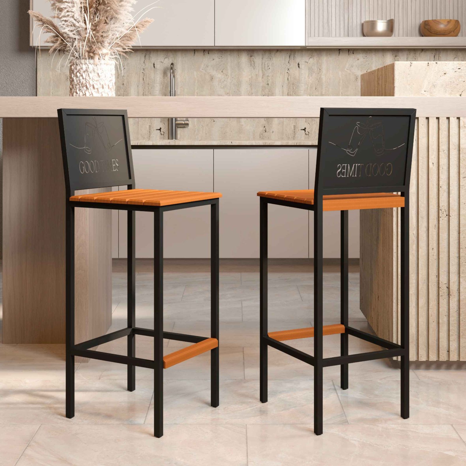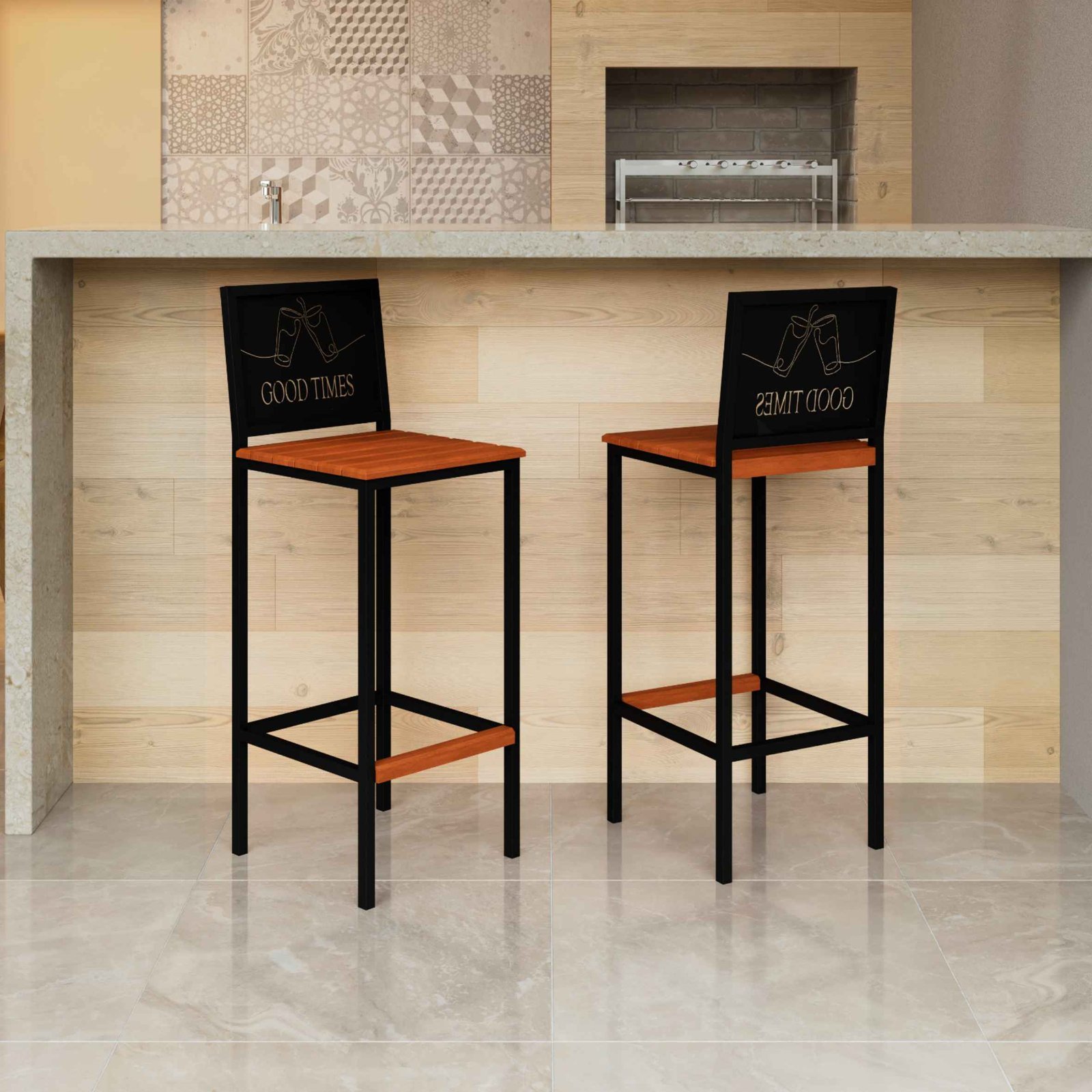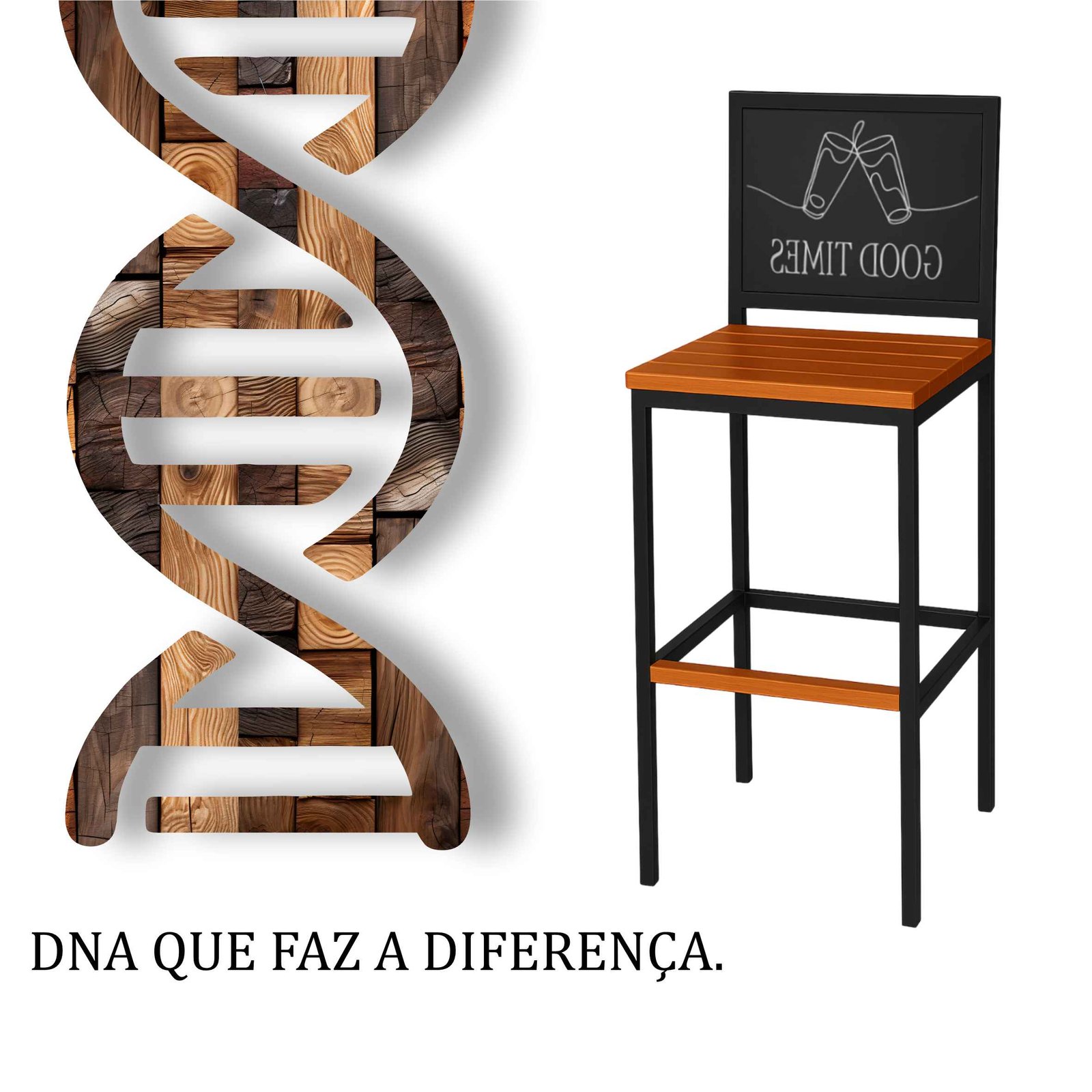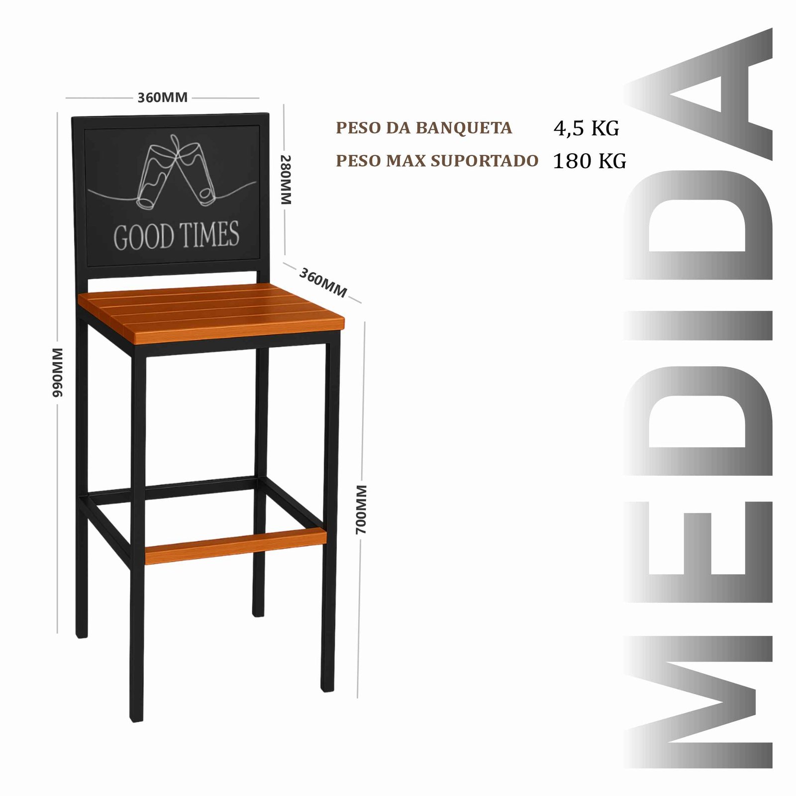Banqueta Good Times com encosto em estrutura aço carbono, com pintura eletrostática, com encosto de chapa de aço 0,6mm, assento de madeira maciça de demolição.