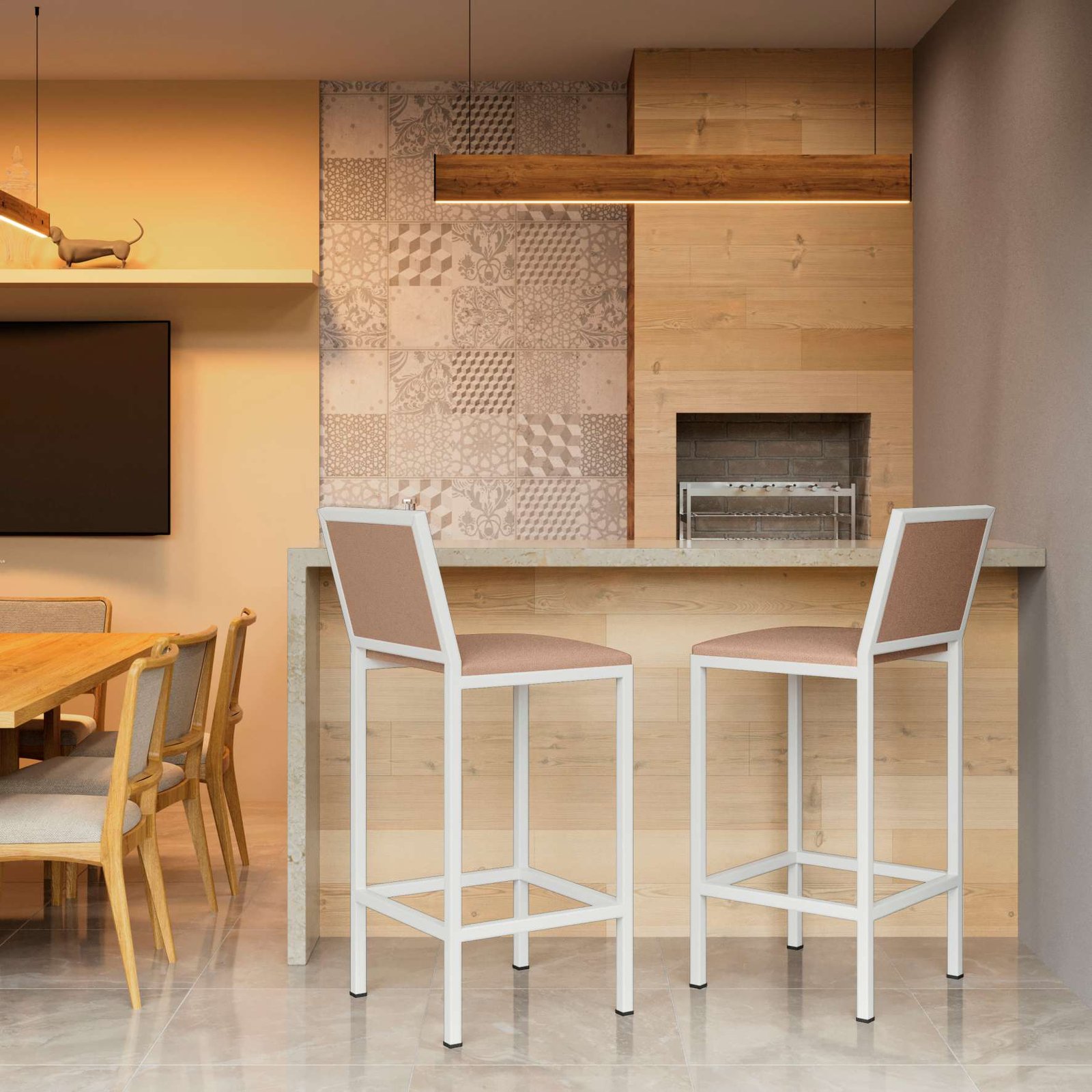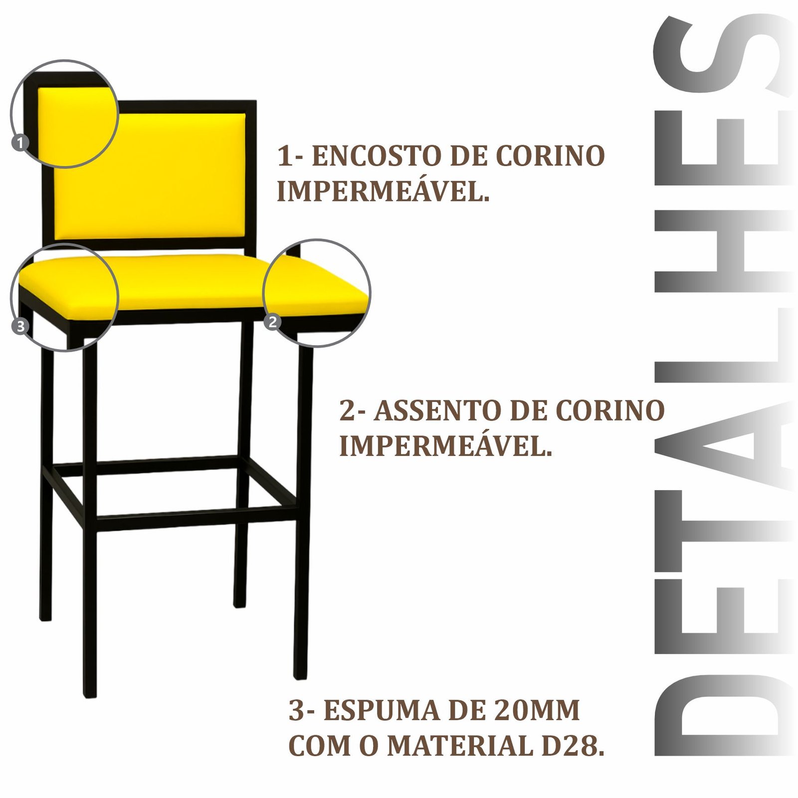 Banqueta Viena com estrutura de aço carbono, com pintura eletrostática, com encosto e acento em corino almofadado.