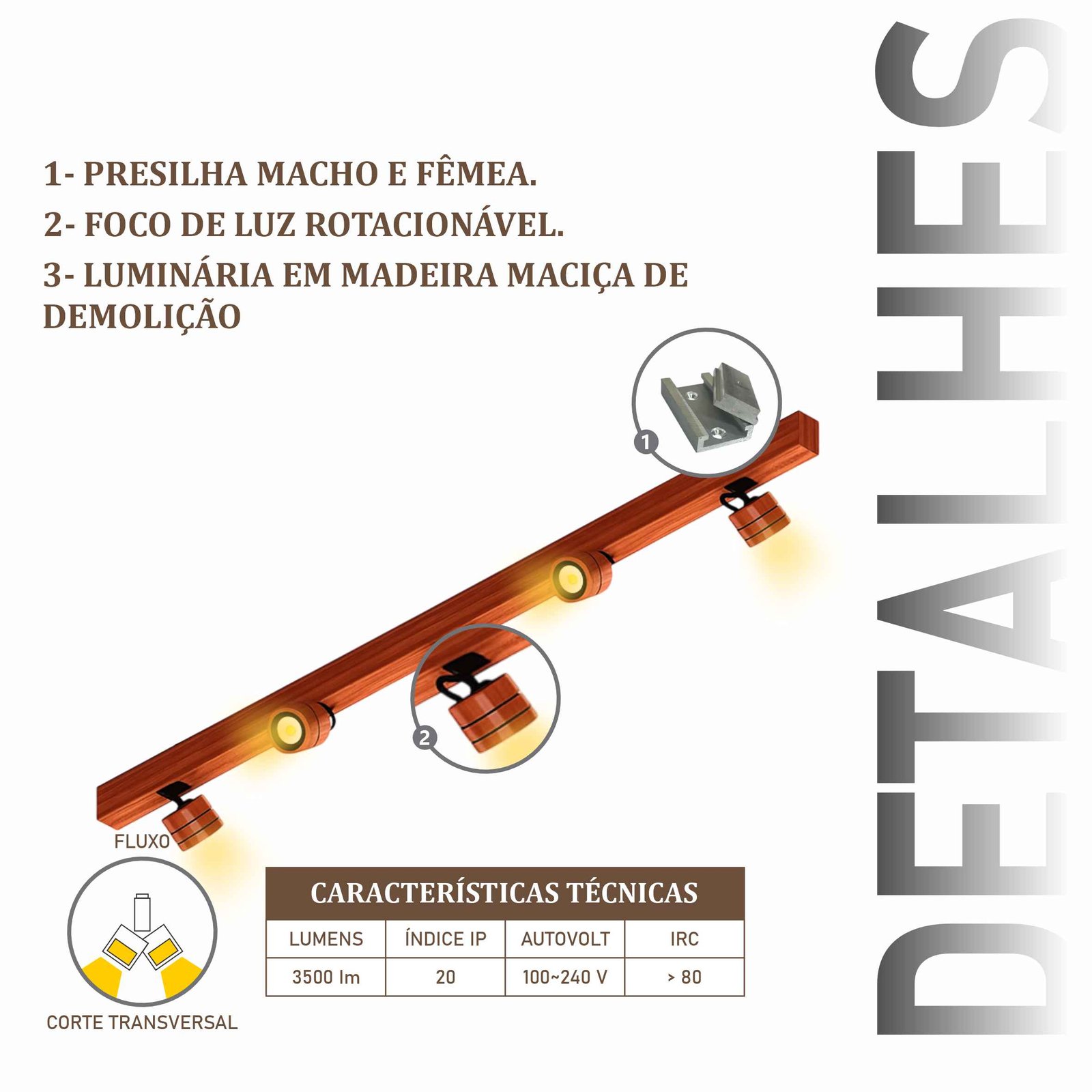 Luminária em madeira maciça de demolição. Produto composto por 5 spots de 7w no centro, com total de 35w. Design contemporâneo para diversos ambientes.