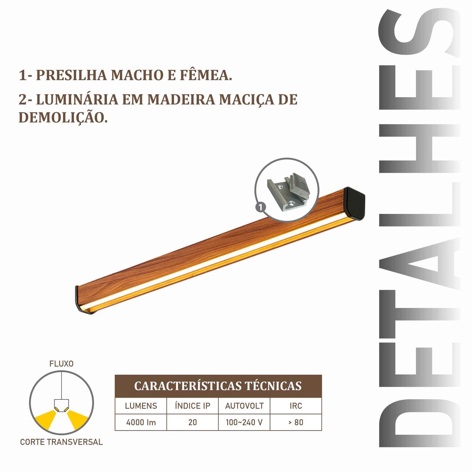 Luminária em madeira maciça de demolição. Produto com 2 perfil de LED no centro, com driver embutido de 36w. Design contemporâneo para diversos ambientes.