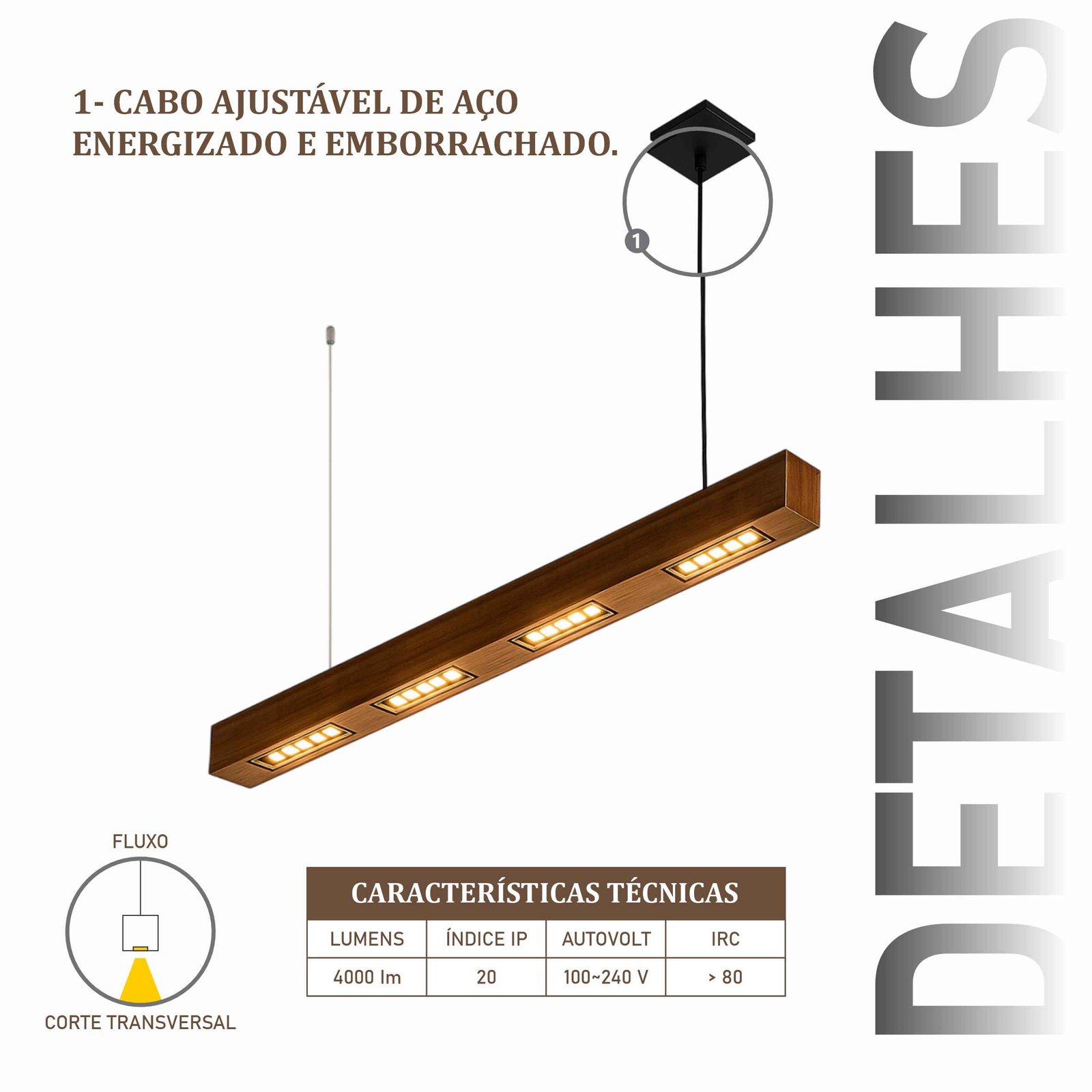 Pendente em madeira maciça de demolição. Produto com 4 spots de 10w embutido. Design contemporâneo para diversos ambientes.