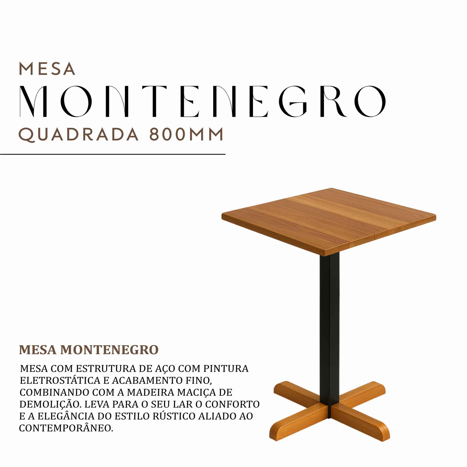 A Mesa Montenegro Quadrada 800x800mm em madeira maciça de demolição combina rusticidade e elegância em um design robusto e versátil. Seu acabamento natural valoriza os veios e tons da madeira, tornando cada peça única. Ideal para restaurantes, varandas e áreas gourmet.