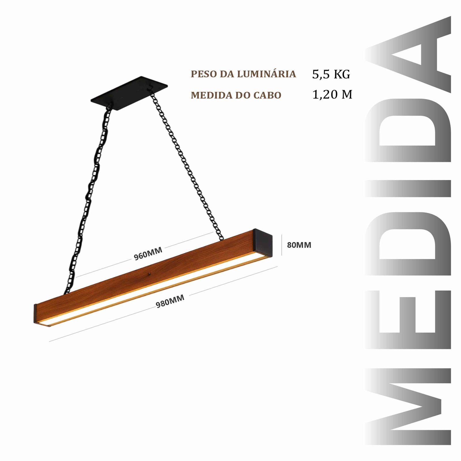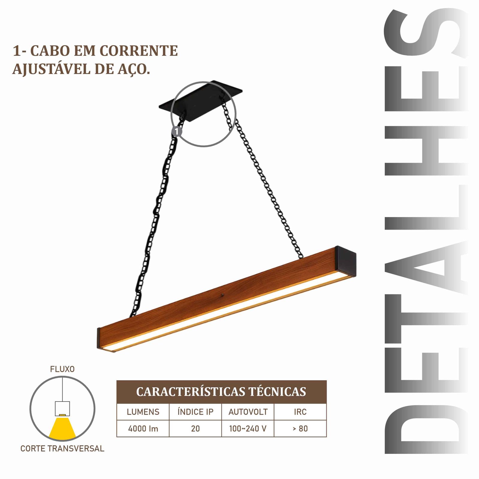 Pendente em madeira maciça de demolição. Produto com 1 perfil de LED no centro, com driver embutido de 36w. Design contemporâneo para diversos ambientes.