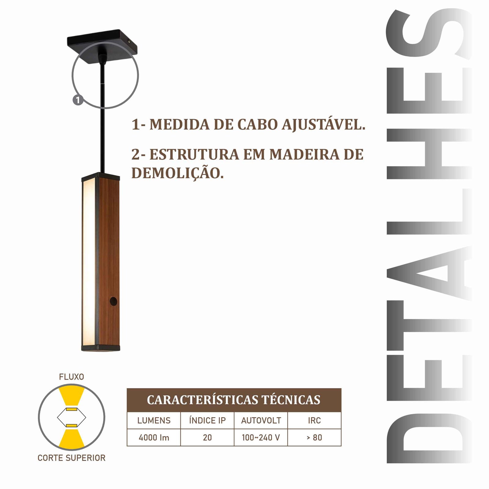 Nossas luminárias são produzidas com madeira de demolição. Cada peça é única, com marcas do tempo, veios escurecidos, furos e variações de cor que valorizam qualquer ambiente.