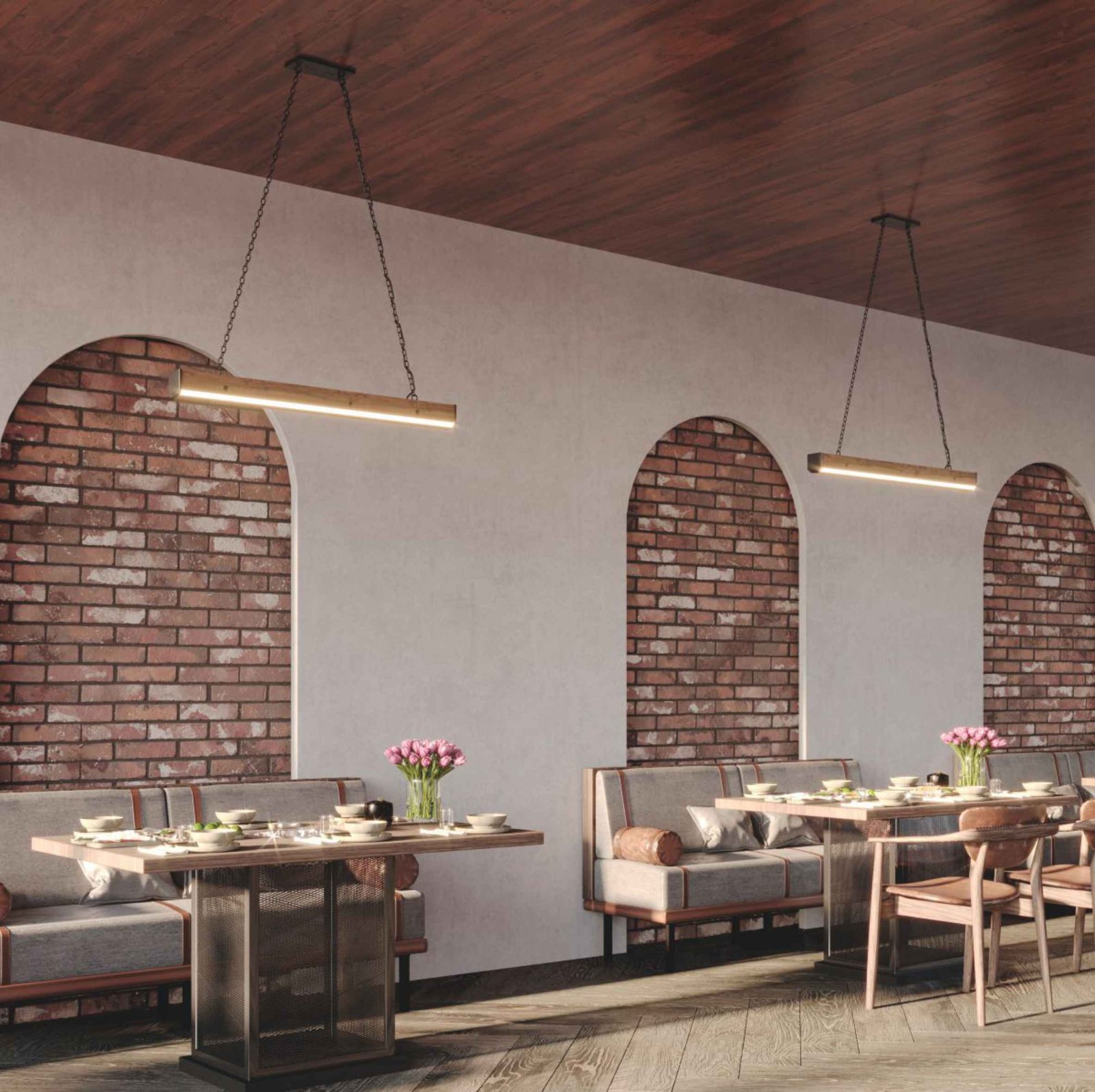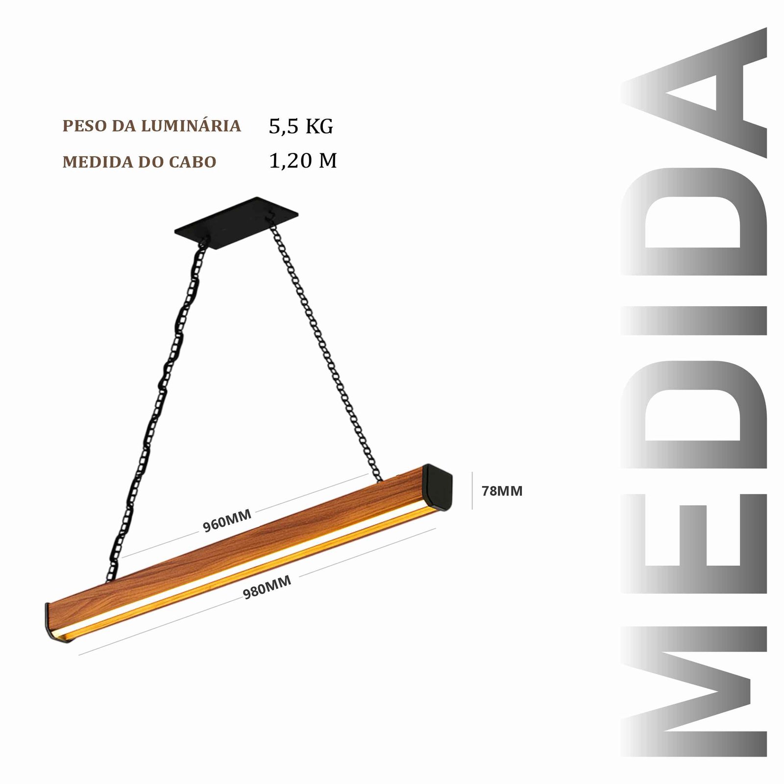 Pendente em madeira maciça de demolição. Produto com 2 perfil de LED no centro, com driver embutido de 36w. Design contemporâneo para diversos ambientes.
