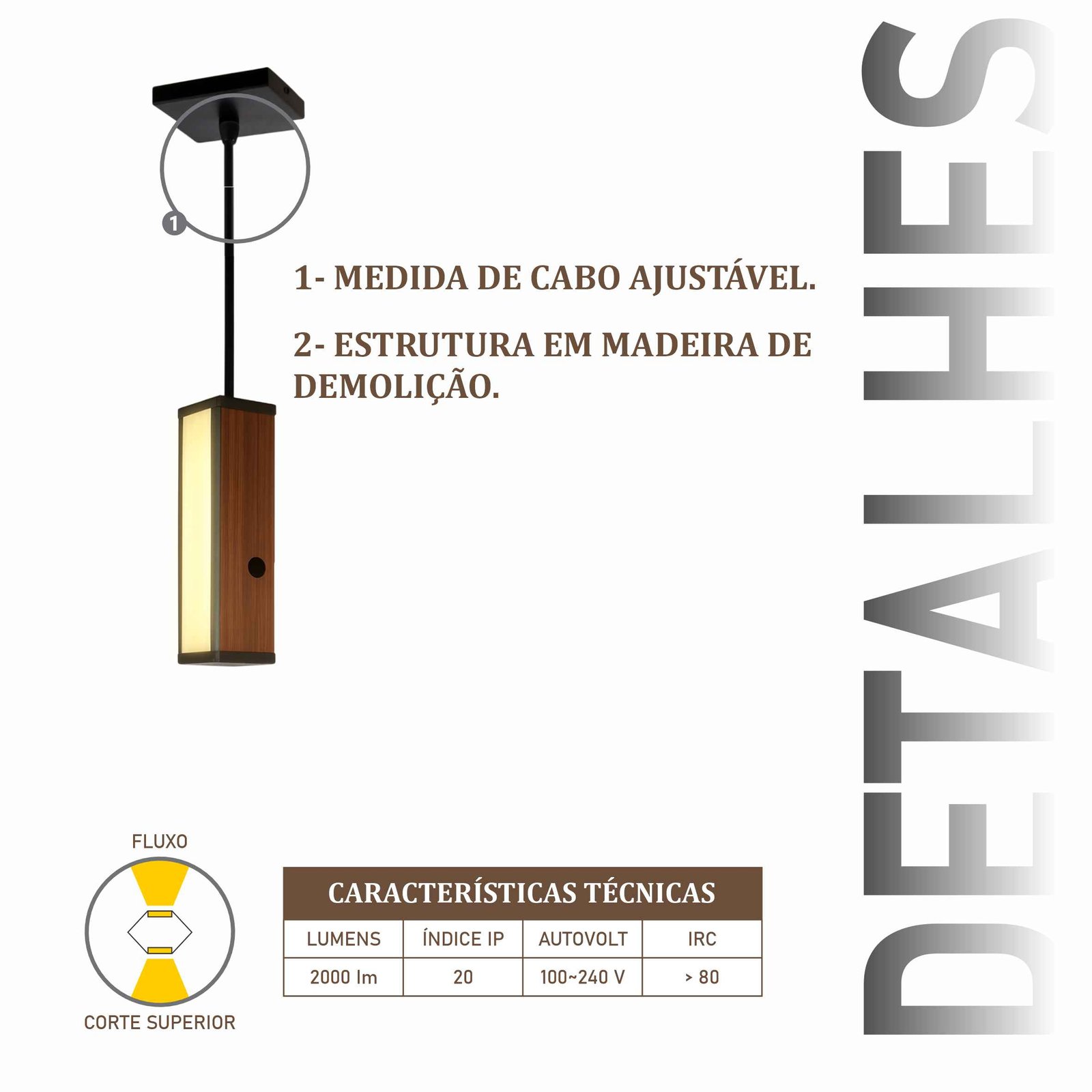 Nossas luminárias são produzidas com madeira de demolição. Cada peça é única, com marcas do tempo, veios escurecidos, furos e variações de cor que valorizam qualquer ambiente.